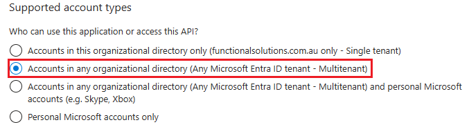 Under Supported account types make sure Accounts in any organizational directory (Any Microsoft Entra ID tenant - Multitenant) Is selected.